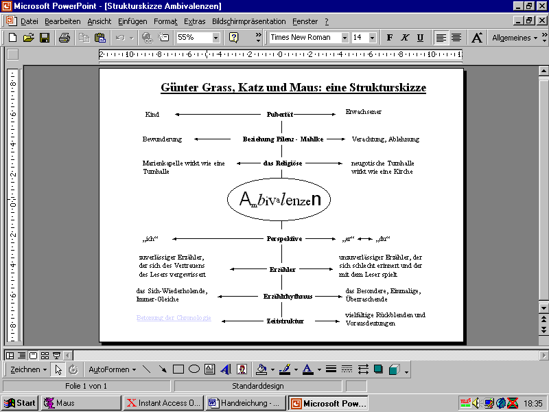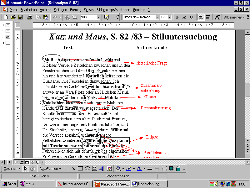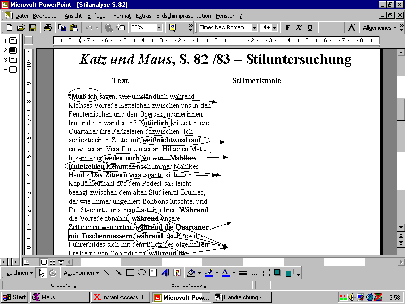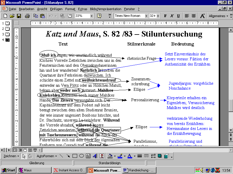 Bezogen auf Katz und Maus könnte ein etwas längerfristig angelegter Arbeitsauftrag (3 -4 Std.?) lauten, eine Figurengalerie zu erstellen, in der die Schüler jede wichtige Figur der Novelle vorstellen. Aufgabe der Schüler wäre es, die äußeren und inneren Charaktermerkmale der einzelnen Figuren am Originaltext herauszuarbeiten, mit Textstellen zu belegen und ihre Ergebnisse auf einer PowerPoint-Folie festzuhalten. Das Zitieren der Belegstellen könnte entweder direkt auf der jeweiligen Folie erfolgen oder wieder über einen Hyperlink.